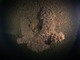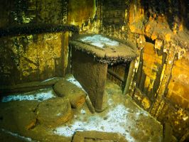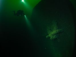 Śródokręcie wraku jest najbardziej zniszczone. W pobliżu miejsca, w którym statek został trafiony torpedami na prawej burcie, pokład i burty zapadły się, tworząc plątaninę blach, lin stalowych i kabli. Niemniej jednak, dalej można dostrzec elementy osprzętu: olbrzymie knagi, zawory i rury do transportu paliwa.