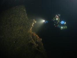 Najmniejsza głębokość na wraku to 50 m na pokładzie dziobowym i górnym pokładzie sterówki, na którym znajduje się zachowane w doskonałym stanie koło sterowe. Poniżej znajduje się drugie koło sterowe, umiejscowione wewnątrz sterówki, do której można zajrzeć przez otwarte drzwi z prawej i lewej burty. Wewnątrz sterówki można również rozpoznać kompas okrętowy, znajdujący się przed kołem sterowym. Pokryty jest omułkami i osadami dennymi, jednak łatwo można rozpoznać jego charakterystyczne rysy. Na przedniej ścianie sterówki znajdują się sporych rozmiarów okna wyposażone w wirujące szyby (Ekran Kenta), wykończone mosiężnymi detalami. Wrak stoi na stępce i ma charakterystycznie zakopaną rufę. Wydawałoby się, jakby jakaś wielka siła oparła się o jego tylną część, wciskając ją w dno, w skutek czego dziób uniósł się do góry i góruje nad dnem odsłaniając stępkę. Część rufowa wraku jest osieciowana. Głębokość na rufie i przy dnie wynosi 63 m. W miejscu zalegania wraku występują czasami bardzo silne prądy.